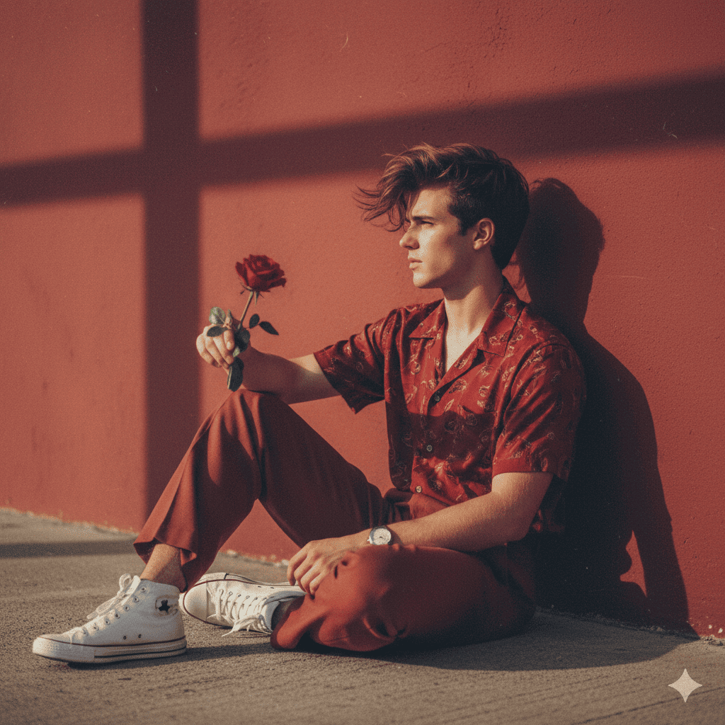 A full-body, side-angle portrait of a handsome 22-year-old boy, approximately 5’5″ tall. He is sitting on the ground in a
